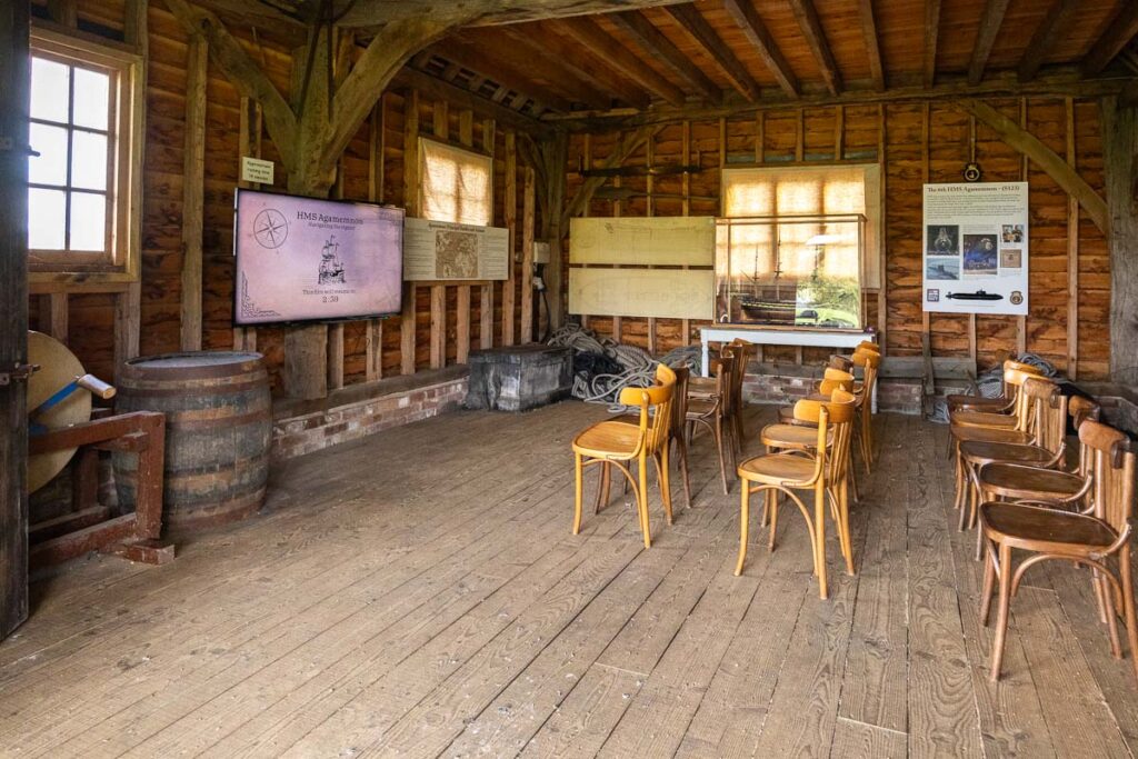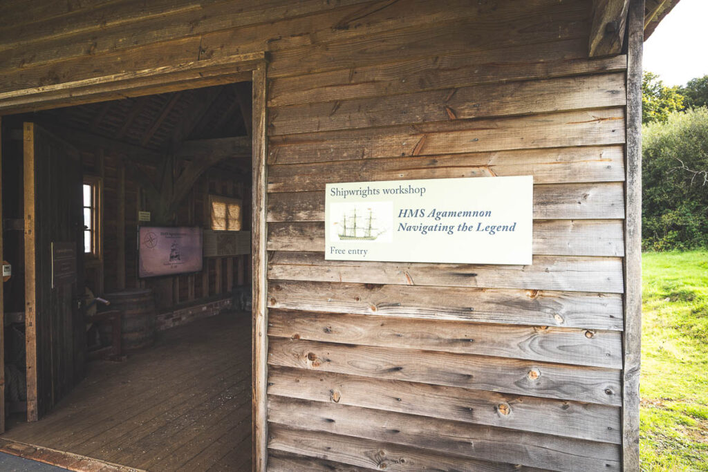 Perched alone on a grassy slope sits a barn-type building. I am unsure as to its permanent purpose, but for now, it displays a presentation and signs indicating an exhibit all about the HMS Agamemnon.