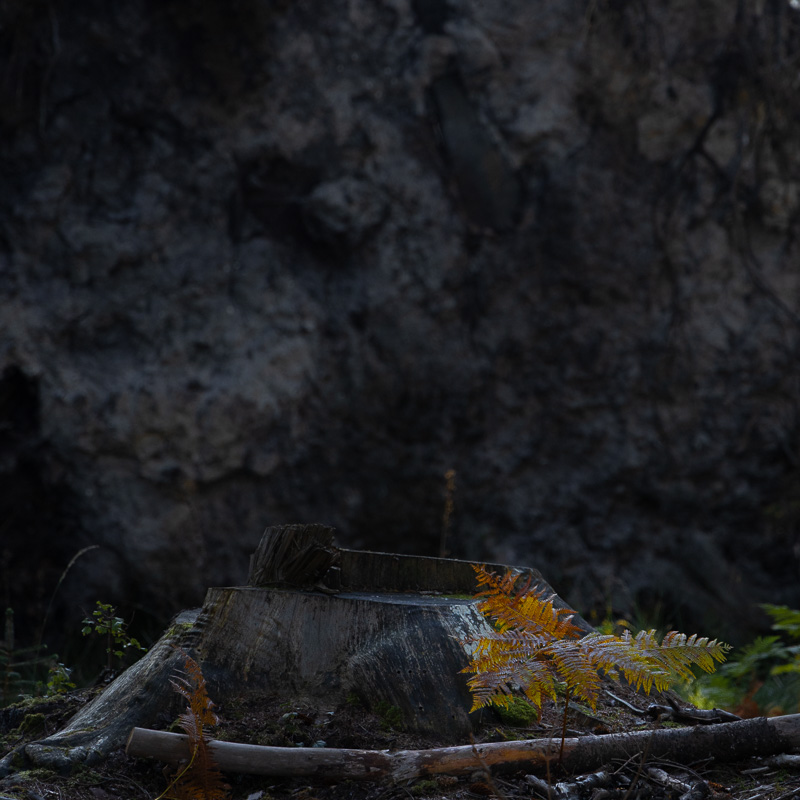 A small fern grows near where the trunk once stood proud and tall, signifying perhaps the circle of life. The contrast is seen yet again, this time with the semi-vibrant orange against the dead surroundings of the tree.